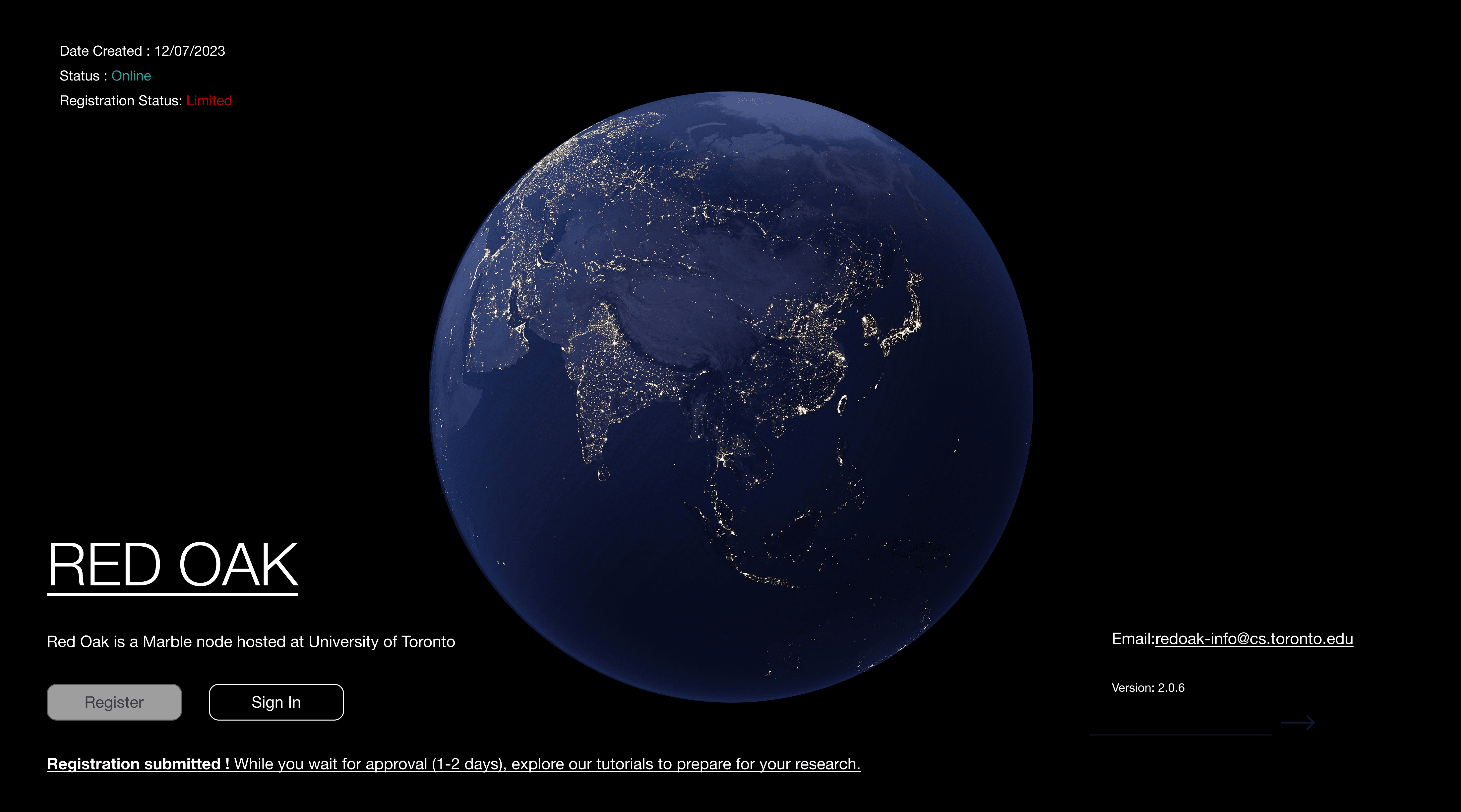 The post-submission confirmation now said: "Registration submitted! While you wait for approval (1-2 days), explore our tutorials to prepare for your research." With direct links to getting-started resources.