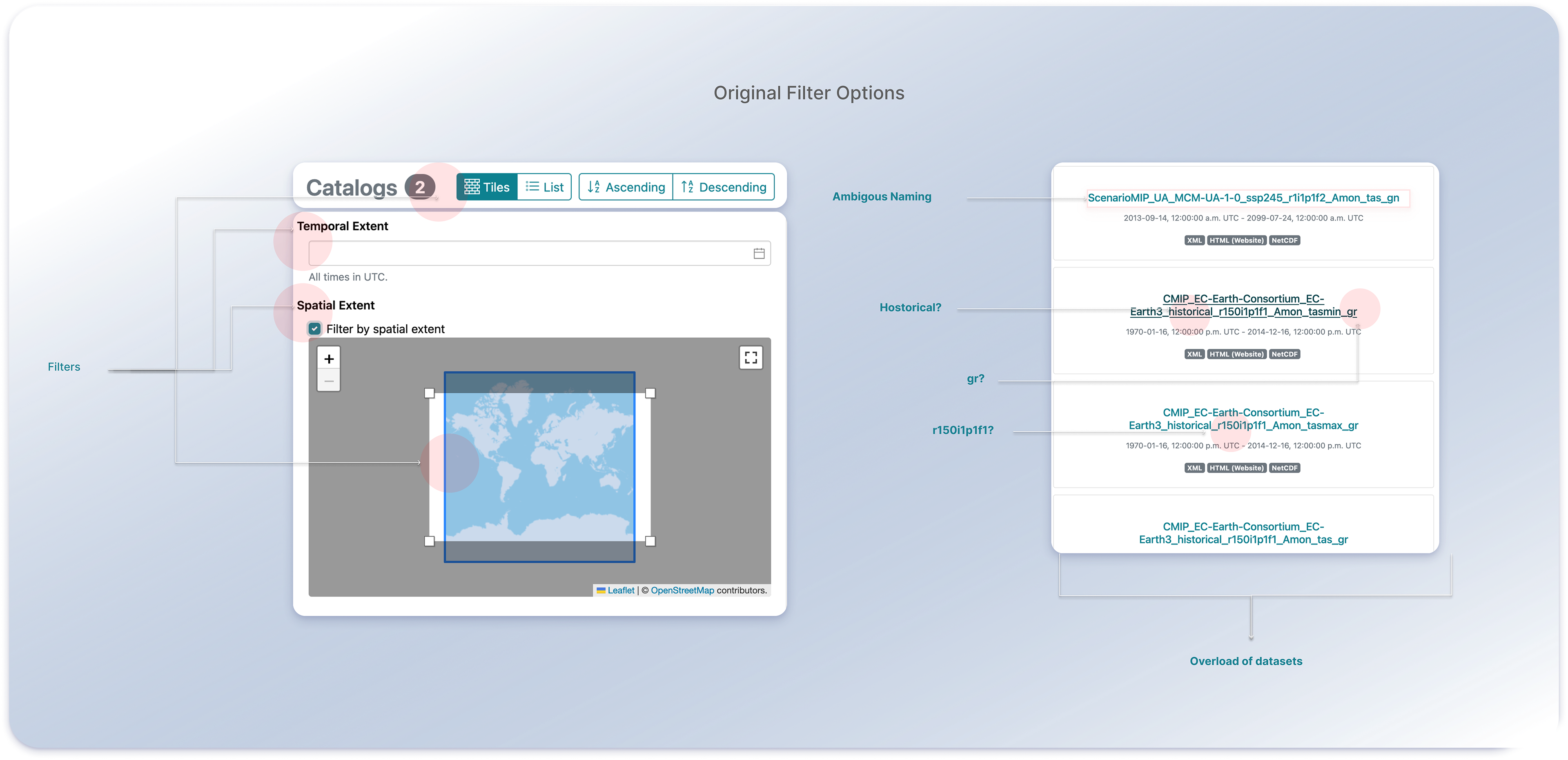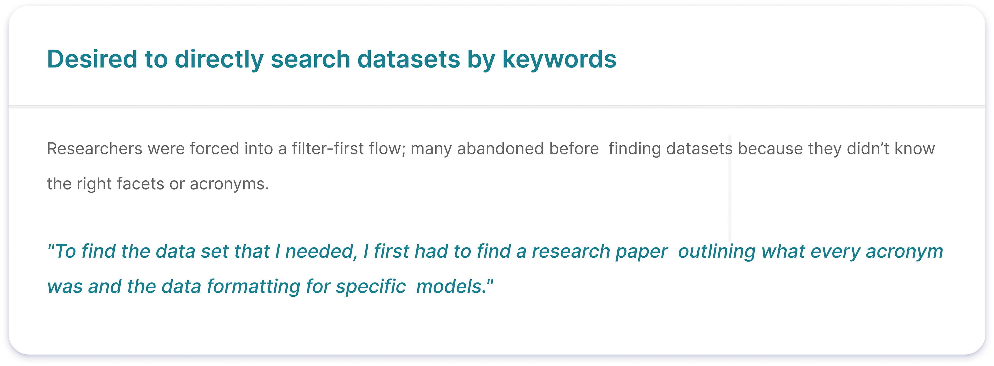 • Researchers were forced into a filter-first flow; many abandoned before finding datasets because they didn’t know the right facets or acronyms.