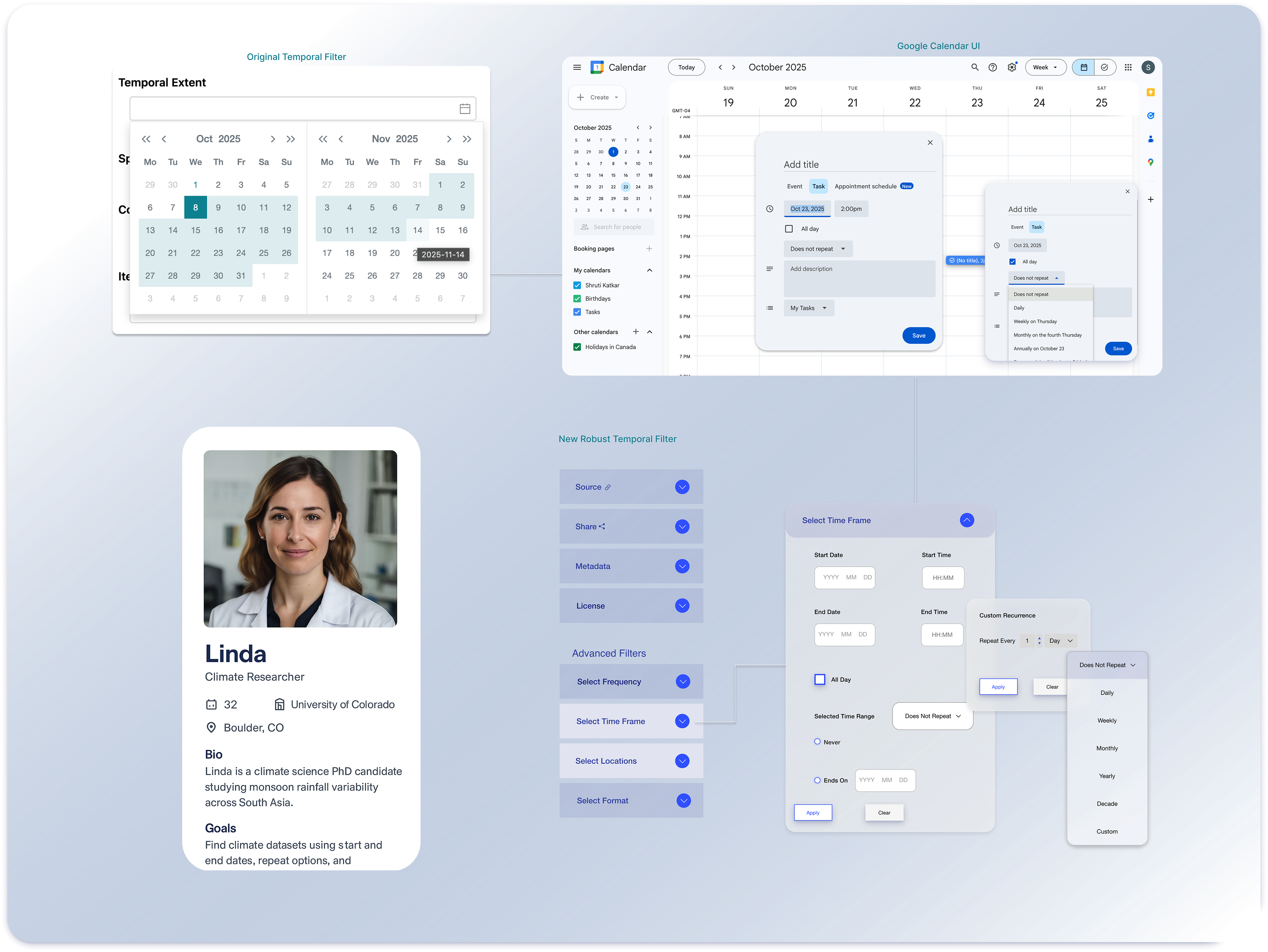 Using the Law of Similarity, I grouped temporal filters—start/end dates, recurrence, and advanced options—under a consistent design language. For researchers like Linda, this made dataset filtering intuitive, reduced errors, and accelerated discovery.